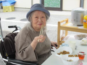 天気も良く、皆さんで施設の外に出て、焼きたてのお肉や焼きそばを堪能しました〜🎶