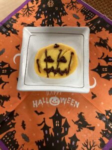 クッキーの生地にかぼちゃを入れてホットプレートで焼き、チョコペンでかぼちゃのお化けを書きました✨