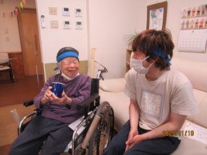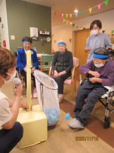 洋服に玉をたくさん仕込んで、狙いを定めポーンと!風船バレーは白熱!職員も本気です^^