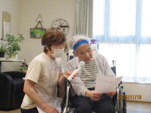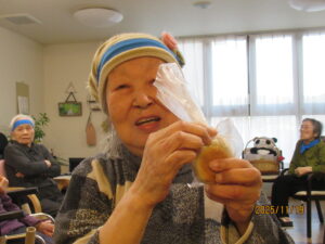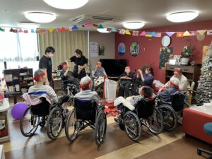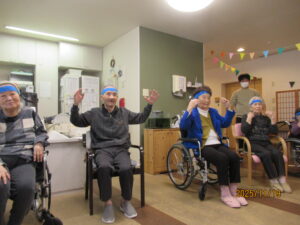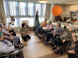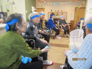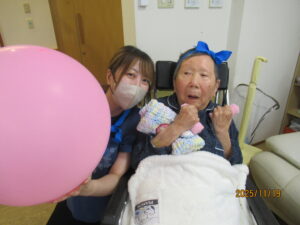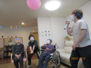 洋服に玉をたくさん仕込んで、狙いを定めポーンと!風船バレーは白熱!職員も本気です^^
