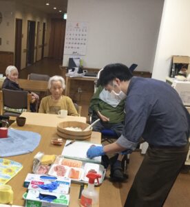 栄養調理課の主任さんが、目の前で海鮮丼を作るライブキッチンをして下さり、入居者様にも取り分けや、うちわで仰ぐ工程のお手伝いをお願いいたしました👏